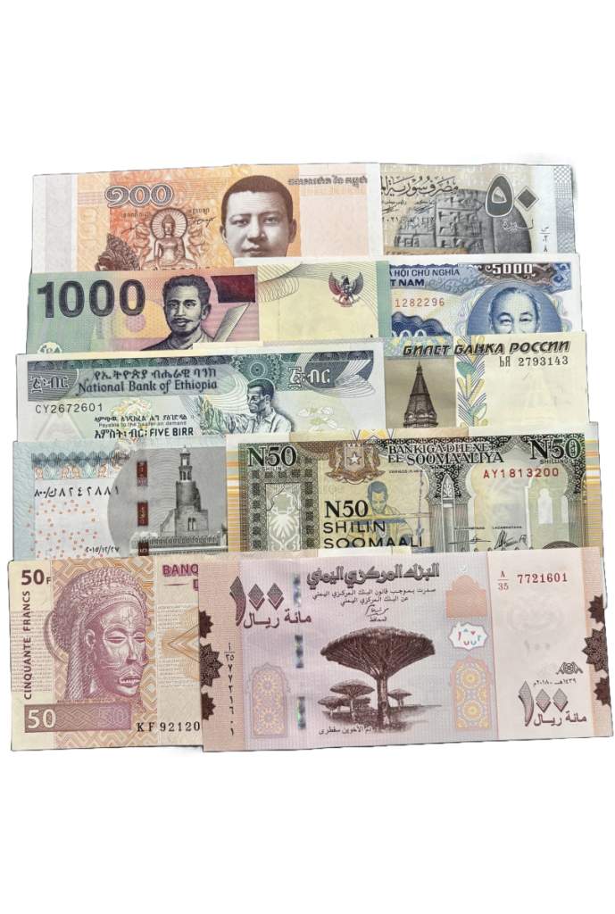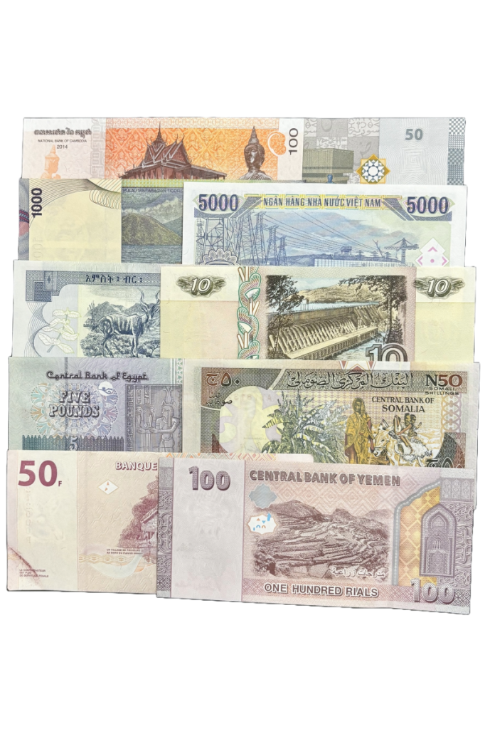 Includes 10 authentic banknotes from Syria, Cambodia, Indonesia, Vietnam, Ethiopia, Russia, Egypt, Somalia, Congo, and Yemen.