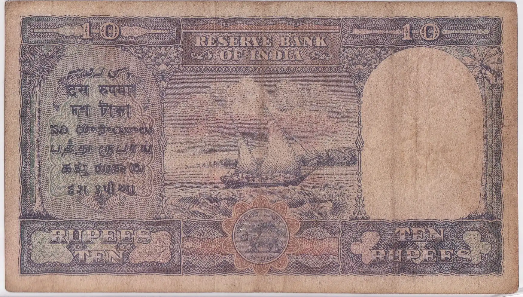 The front side of the note (first image) features the text “RESERVE BANK OF INDIA” at the top center. Below this, there is a traditional sailing boat, known as a dhow, depicted in intricate detail on the sea, which reflects India’s rich maritime heritage. The denomination “TEN RUPEES” is clearly printed at the bottom corners. On the left side, the value “Ten Rupees” is written in multiple Indian languages, emphasizing the multilingual character of Indian currency.