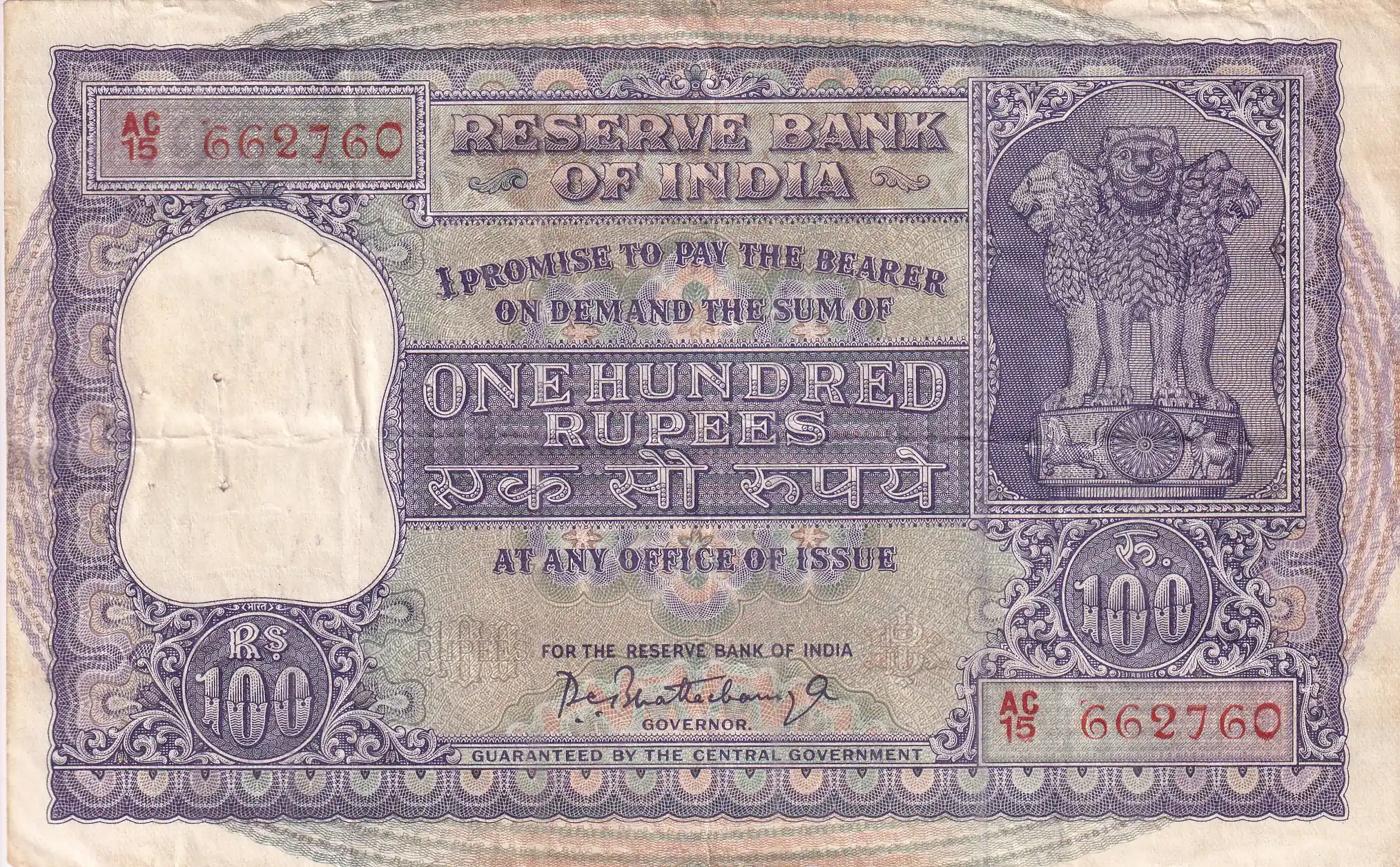 100 Rupees 1960 Signed By P C Bhattacharya Note