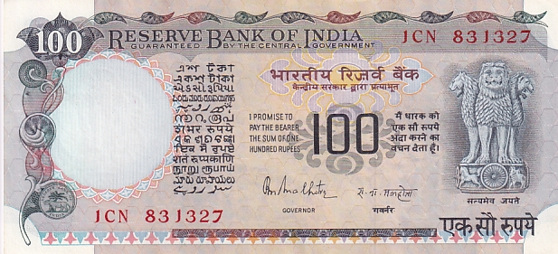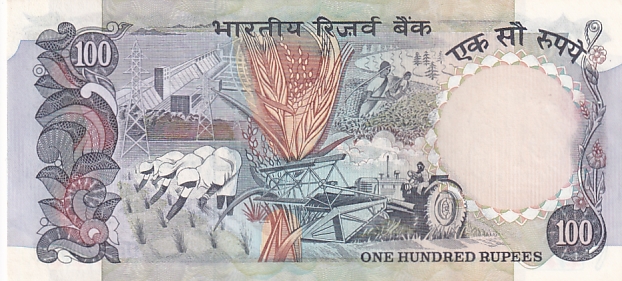 Rare 100 rupees “cobalt blue” note from RBI’s Agriculture Series, signed by Governor R N Malhotra (1985–1990). Features iconic Ashoka Pillar emblem, rural farming theme with tractor and wheat on reverse, and multi-lingual denomination panel. Known for vibrant blue-brown design, large format, and uncirculated (UNC) condition, it is highly sought after by collectors.