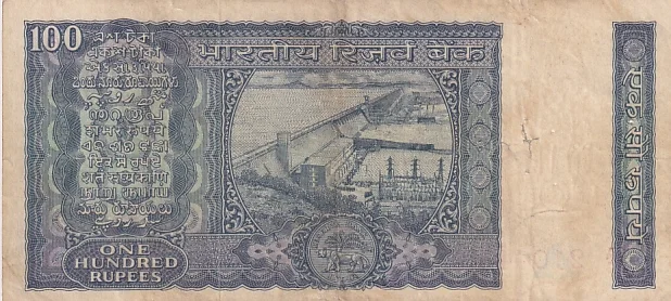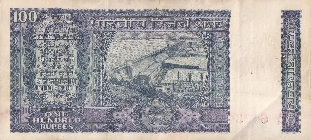 Flipping to the reverse, be captivated by a picturesque dam that graces the center of the note. The Reverse Bank of India seal, positioned just below the dam, reinforces the note’s official status. The lettering “ONE HUNDRED RUPEES” and “REVERSE BANK INDIA” completes the visual narrative, seamlessly marrying nature and finance.