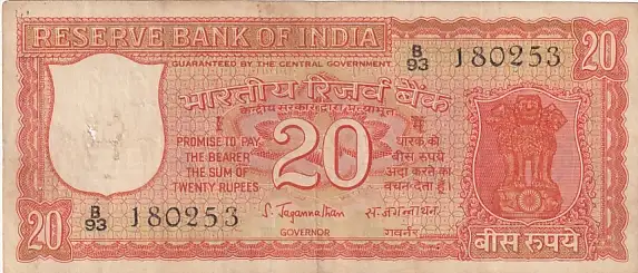 India 20 Rupees S Jagannathan 1972 Incorrect Kashmiri Issue Note