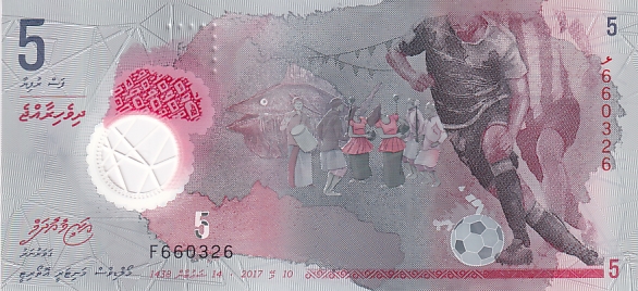 Maldives 5 Rufiyaa 2017 is a grey‑red polymer note from the Maldives Monetary Authority depicting Maldivian culture and sport.