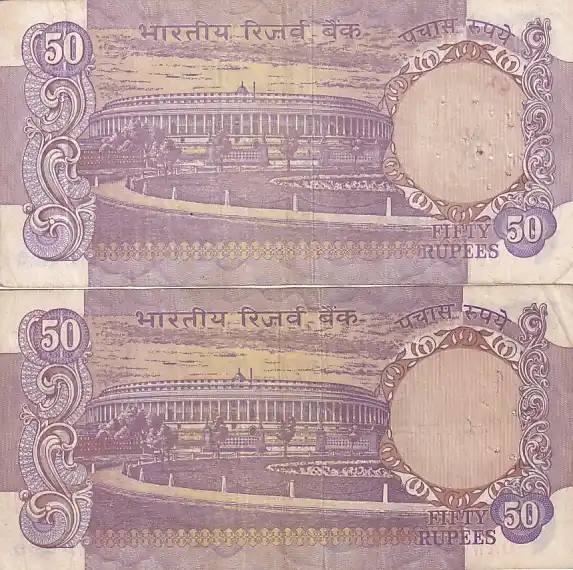 This set includes two vintage 50 Rupees notes from the Reserve Bank of India, featuring serial numbers 8DU 929834 and 0AW 880449. Both notes display the portrait of the Ashoka Pillar on the front and the image of the Indian Parliament building on the reverse. The notes feature bilingual inscriptions, promise text, and multiple Hindi and English languages for denominations. These collectible notes have signatures from the RBI Governor and are a great addition for currency collectors interested in classic pre-2000 Indian banknotes. The condition and serial numbers can be verified as per the provided scan images.