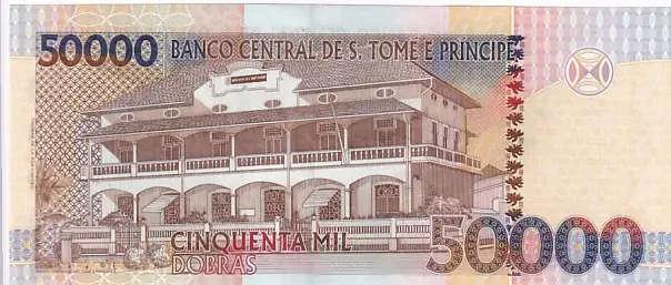 São Tomé and Príncipe 50,000 Dobras 2013 UNC is a high‑value note issued by Banco Central de S. Tomé e Príncipe, featuring national hero Rei Amador and a colorful Conóbia kingfisher on the front with complex geometric patterns and security features. The reverse shows the Central Bank building in São Tomé with the denomination “50 000 Dobras” and “Cinquenta Mil Dobras” prominently displayed.