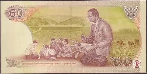 - Denomination “60” in large stylized numerals at the bottom with Thai text, signatures of the Finance Minister and Governor of the Bank of Thailand, and the Garuda coat of arms above.