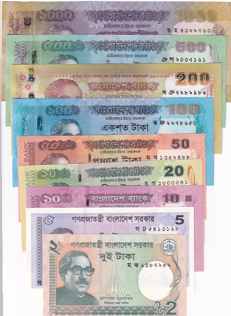 - Denominations: 2, 5, 10, 20, 50, 100, 200, 500 and 1,000 taka, each in different colors and sizes for easy identification.