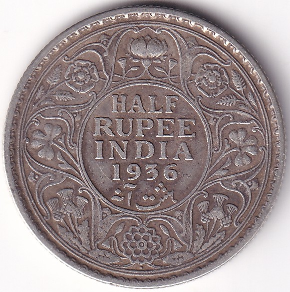 The 1936 Bombay Mint Half Rupee silver coin from British India is a coveted relic of colonial numismatics. Crafted in .917 fine silver, it weighs around 5.83 grams and has a diameter of 24.4–24.6 mm, featuring a milled edge for durability. The obverse displays King George V crowned and robed, with an elephant on his robe—his dignified left-facing bust is encircled by the legend “GEORGE V KING EMPEROR”. The reverse reads “HALF RUPEE INDIA 1936” in bold, enclosed by a double-line circle and a floral scroll of roses, thistles, shamrocks, and lotuses—a nod to Indo-British symbolism. The coin is identified as a Bombay Mint issue by the small dot below the date, a crucial mark for collectors. This coin represents the final year of King George V’s reign, combining historic significance, high silver purity, and detailed artistry—an essential acquisition for numismatic enthusiasts.