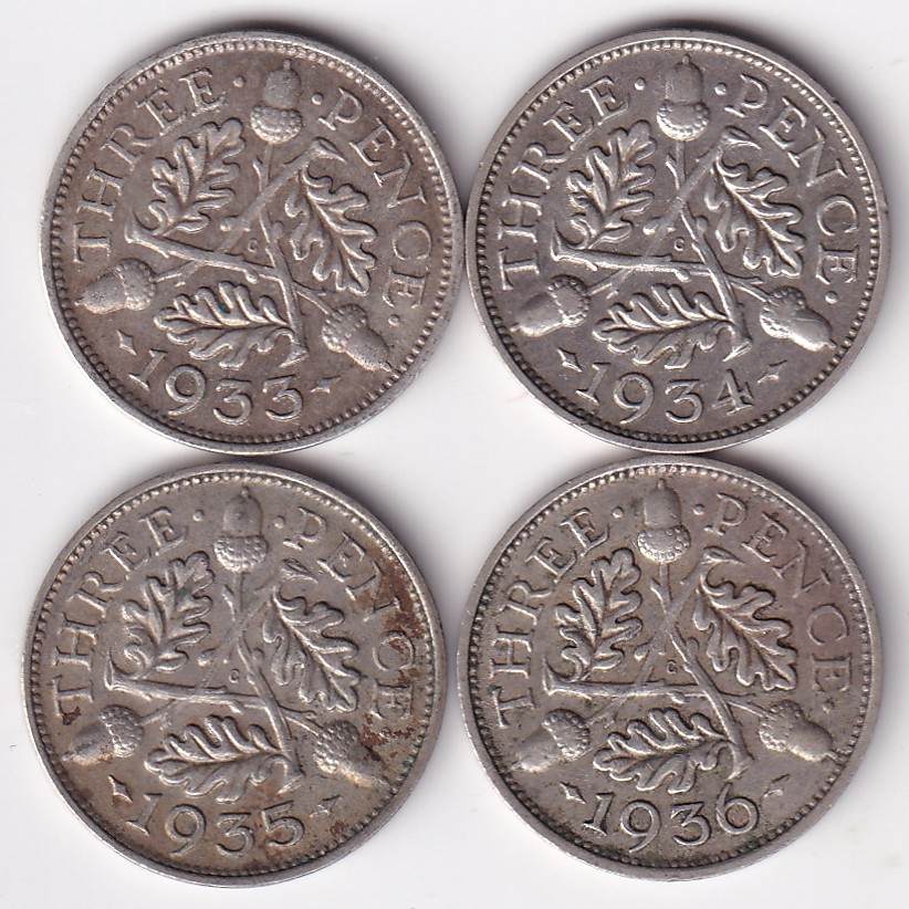 British George V Silver Threepence Coins (1933–1936) Set of 4 Coins