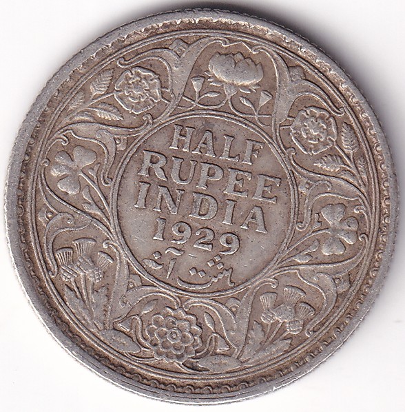 The 1929 Kolkata (Calcutta) Mint Half Rupee silver coin is a highly collectible piece from British India’s colonial era. It features a crowned and robed bust of King George V facing left on the obverse, surrounded by the legend “GEORGE V KING EMPEROR”. The reverse displays “HALF RUPEE INDIA 1929” in bold within a double-line circle, accented by a richly ornamental floral scroll of roses, thistles, shamrocks, and lotuses, blending British and Indian motifs. The coin is struck in .917 fine silver, weighs approximately 5.83 grams, and is about 24.3–24.6 mm in diameter. As a product of the Calcutta Mint, it lacks a dot below the date—a distinguishing trait from Bombay Mint coins. The 1929 Kolkata half rupee is admired for its detailed design, colonial history, and silver purity, making it a valuable addition for serious collectors.