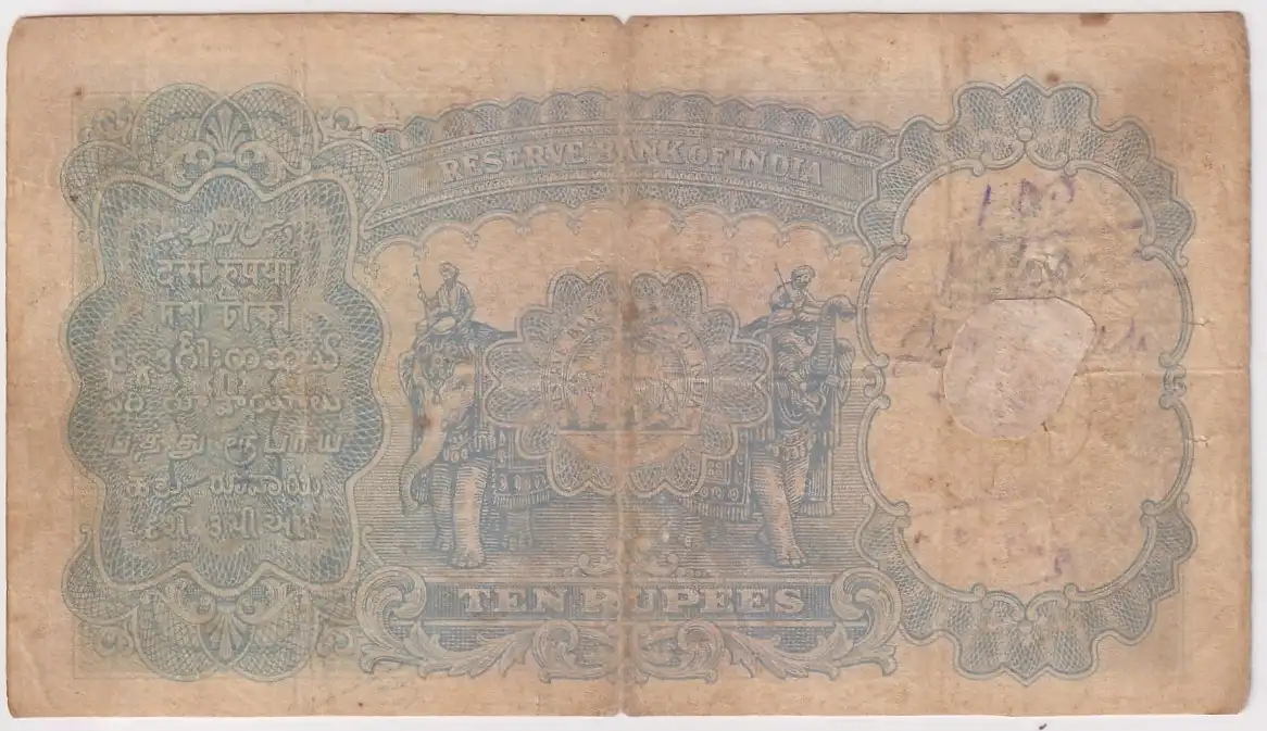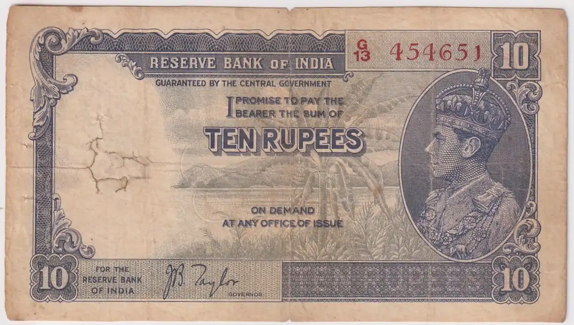 This is a vintage 10 Rupees banknote from the Reserve Bank of India issued during the British colonial period, featuring King George VI.