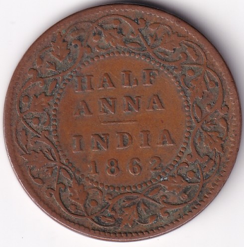 This is a British India copper Half Anna coin from 1862, issued during the reign of Queen Victoria. The obverse side displays the left-facing portrait of Victoria with the inscription “VICTORIA QUEEN” around the rim. The reverse features the coin denomination “HALF ANNA” above “INDIA” and the year “1862,” all surrounded by a decorative wreath made of flowers and leaves. This coin holds significant numismatic interest due to its historical context and association with early colonial coinage in India.