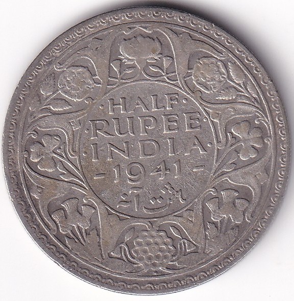 This 1941 Half Rupee coin from British India was struck at the Bombay Mint and features King George VI. The obverse displays the crowned bust of George VI facing left, surrounded by the legend “GEORGE VI KING EMPEROR”. The reverse shows the denomination “HALF RUPEE INDIA 1941” in the center, accented by an ornate wreath of Indian floral motifs and Persian script below.