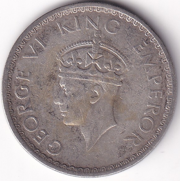A dot below the date marks it as a Bombay Mint issue. The coin contains 50% silver and weighs 5.83 grams with a diameter of 24 mm. Silver debasement began in 1940, and this coin is part of the transitional World War II-era series. It remains a popular collectible for British India numismatic enthusiasts.
