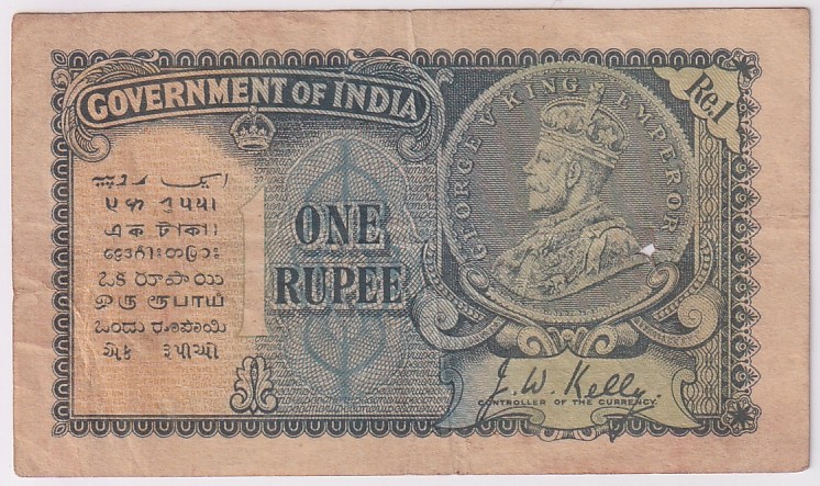 This is a pre-independence British India One Rupee banknote issued in 1935. The note features the portrait of King George V on the obverse side, along with inscriptions in various Indian languages, the denomination “One Rupee,” and the signature of J.W. Kelly, who was the Controller of the Currency at that time. The reverse of the note prominently displays the denomination within an ornate circular design, along with the date “1935” and a serial number. Notes from this era are valued by collectors for their historical significance, design, and association with British rule in India.