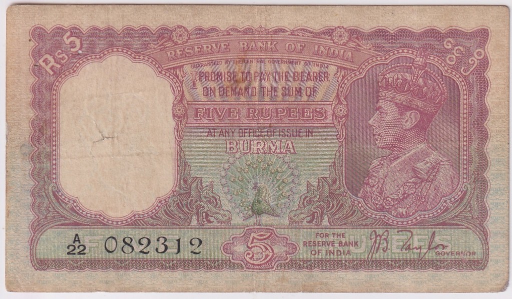 On one side of the note, you can see a portrait of King George VI, symbolizing British rule, along with a peacock illustration below, which is an important cultural symbol for Burma. The promise statement on the note clearly says it is payable only at offices in Burma. The serial number and the signature of J.B. Taylor, who was the Governor of the Reserve Bank of India, are displayed as official markers.