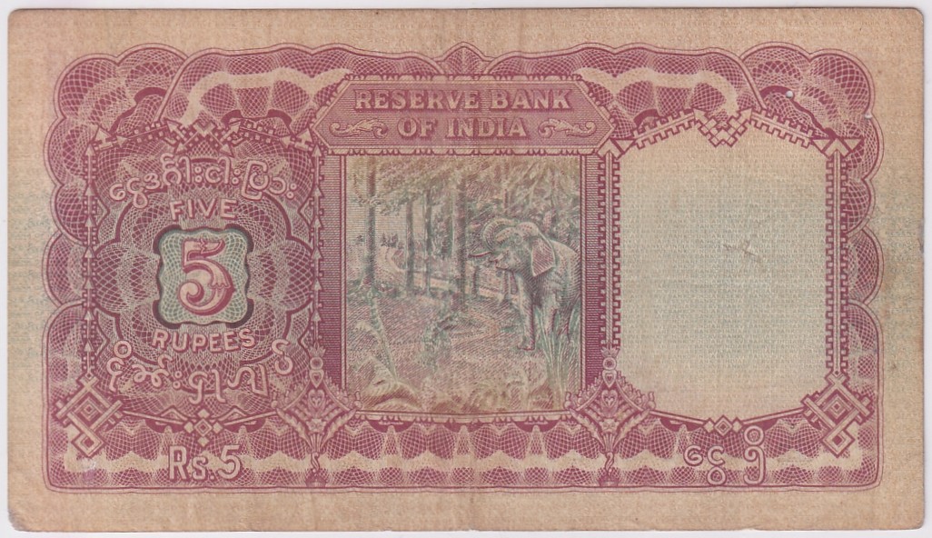 The other side of the note features an elephant in a Burmese forest, highlighting the region’s wildlife and environment. The design also includes multiple languages: English, Burmese, and Shan, reflecting the diverse population of Burma at the time. The text and artwork make it clear that the note was not valid in India and was meant to serve the people of Burma until the country eventually adopted its own currency after independence.