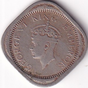 A 1940 British India 2 Annas coin featuring King George VI. It is square-shaped with rounded corners and composed of copper-nickel alloy. The obverse side shows the crowned portrait of King George VI with the inscription “GEORGE VI KING EMPEROR.” The reverse side displays the denomination “2 ANNAS,” the country “INDIA,” and the year “1940” enclosed within a decorative floral border. The coin weighs approximately 5.84 grams and has a diameter of 25 mm.