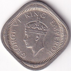 A 1940 British India 2 Annas coin featuring King George VI. It is square-shaped with rounded corners and composed of copper-nickel alloy. The obverse side shows the crowned portrait of King George VI with the inscription “GEORGE VI KING EMPEROR.” The reverse side displays the denomination “2 ANNAS,” the country “INDIA,” and the year “1941” enclosed within a decorative floral border. The coin weighs approximately 5.84 grams and has a diameter of 25 mm.