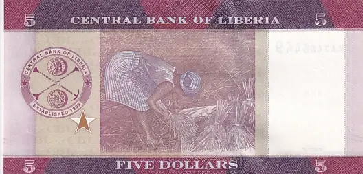Liberia 5 Dollars 2016 UNC is a purple note issued by the Central Bank of Liberia, showing fifth president Edward James Roye with value “5” and “FIVE DOLLARS” on the front. The reverse depicts a woman harvesting rice with the Central Bank of Liberia seal and star, highlighting the importance of agriculture in the country’s economy.