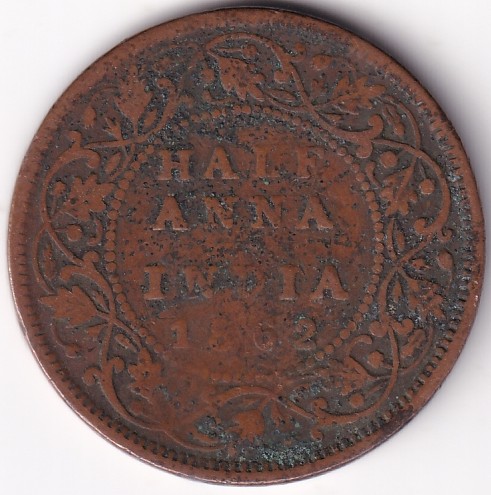 This is a British India copper Half Anna coin from 1862, issued during the reign of Queen Victoria. The obverse side displays the left-facing portrait of Victoria with the inscription “VICTORIA QUEEN” around the rim. The reverse features the coin denomination “HALF ANNA” above “INDIA” and the year “1862,” all surrounded by a decorative wreath made of flowers and leaves. This coin holds significant numismatic interest due to its historical context and association with early colonial coinage in India.