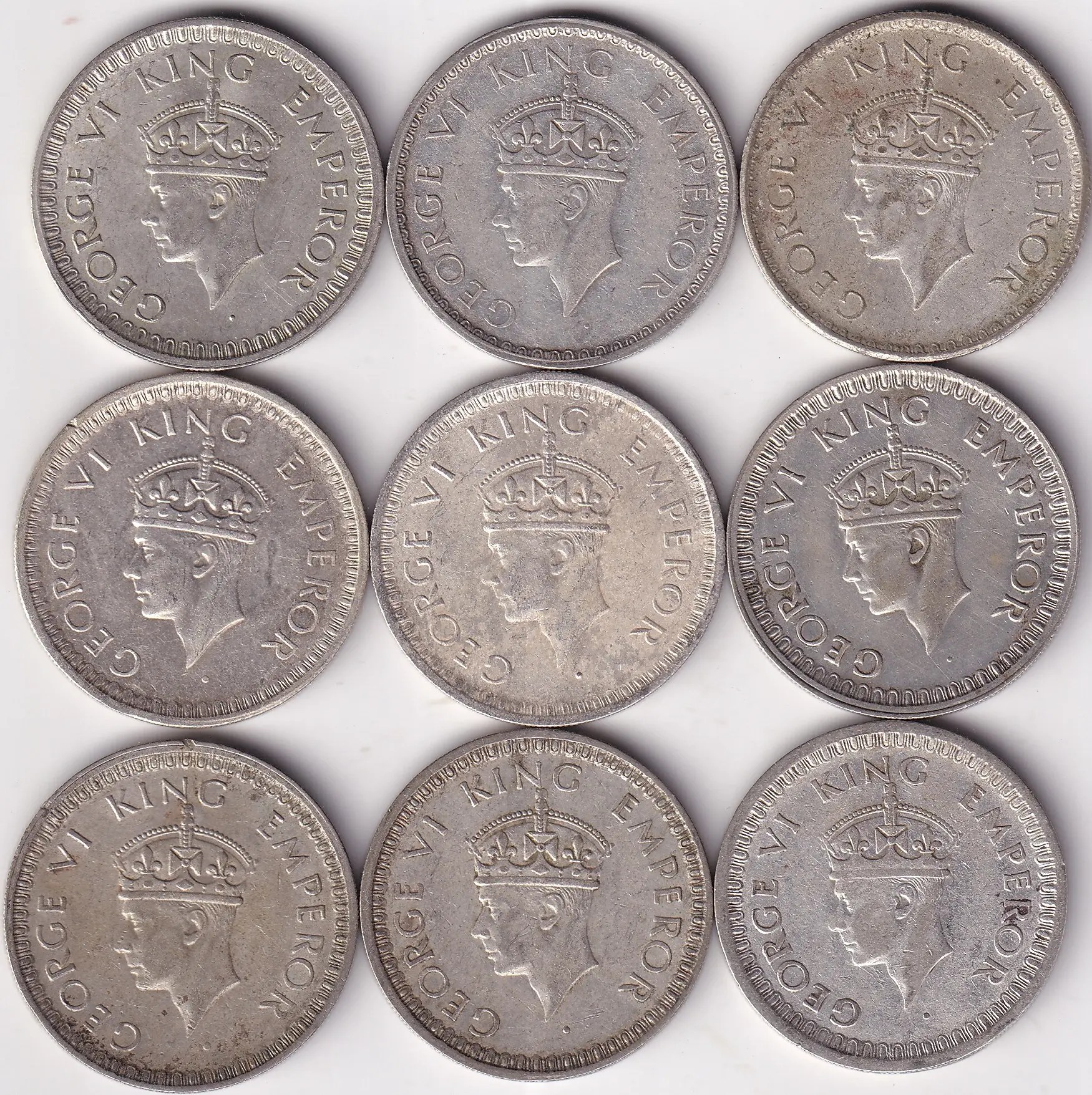 This is a collection of 9 old Indian Half Rupee coins from the time of King George VI, made between 1940 and 1945. Each coin has King George VI’s head with a crown on one side, and on the other, beautiful flower designs and the words “Half Rupee India” with the year. These coins are made of real silver and show the history and style of British India. They are great for anyone who likes old coins or wants to keep a memory of India’s past.