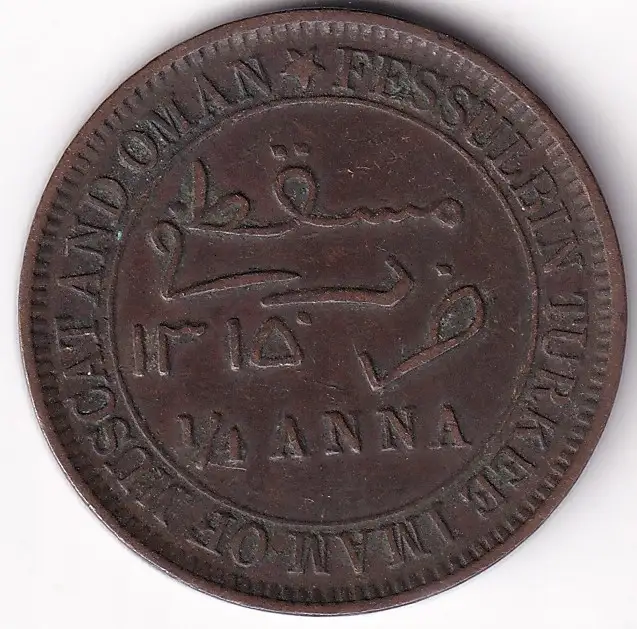 This is an old 1/4 Anna copper coin from Muscat and Oman, made in the year AH 1315 (which is 1898 in the Western calendar). On one side, it says “Fessul bin Turkee Imam of Muscat and Oman” in English and Arabic. It also shows the coin’s value (1/4 Anna) and the year it was made. The other side has more Arabic writing and a leaf design around the edge.