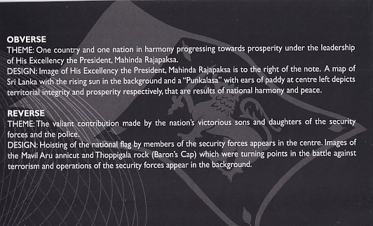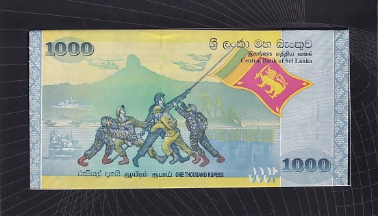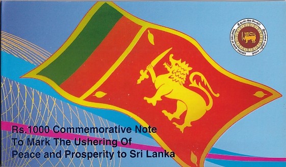 This is Sri Lanka’s 1,000 Rupees “Peace and Prosperity in Sri Lanka” commemorative banknote of 20 May 2009, issued by the Central Bank and commonly supplied in a presentation folder.