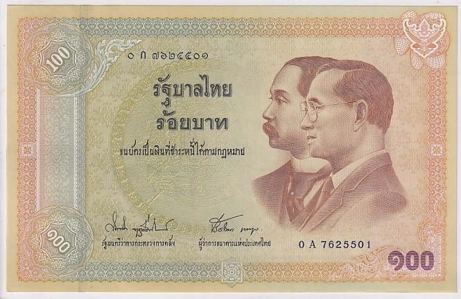 - The modern side carries a right‑facing portrait of King Bhumibol, the Royal Garuda emblem, Thai denomination “100 Baht,” and contemporary government signatures and serial numbers.