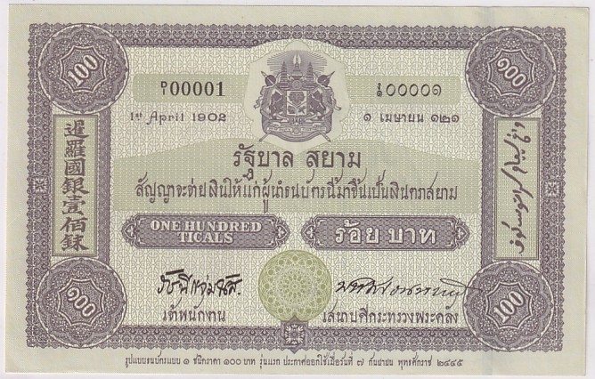 This Thai note is a modern commemorative 100 Baht issue that reproduces the historic 1 April 1902 “Government of Siam” 100 Ticals design on one side and features King Bhumibol Adulyadej (Rama IX) on the other.
