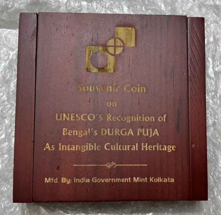 This commemorative coin celebrates UNESCO’s recognition of Bengal’s Durga Puja as Intangible Cultural Heritage. Issued by the India Government Mint Kolkata, it features the iconic image of Goddess Durga and symbolizes the cultural pride and tradition of Bengal’s most famous festival. Ideal for collectors and those honoring India’s rich heritage.