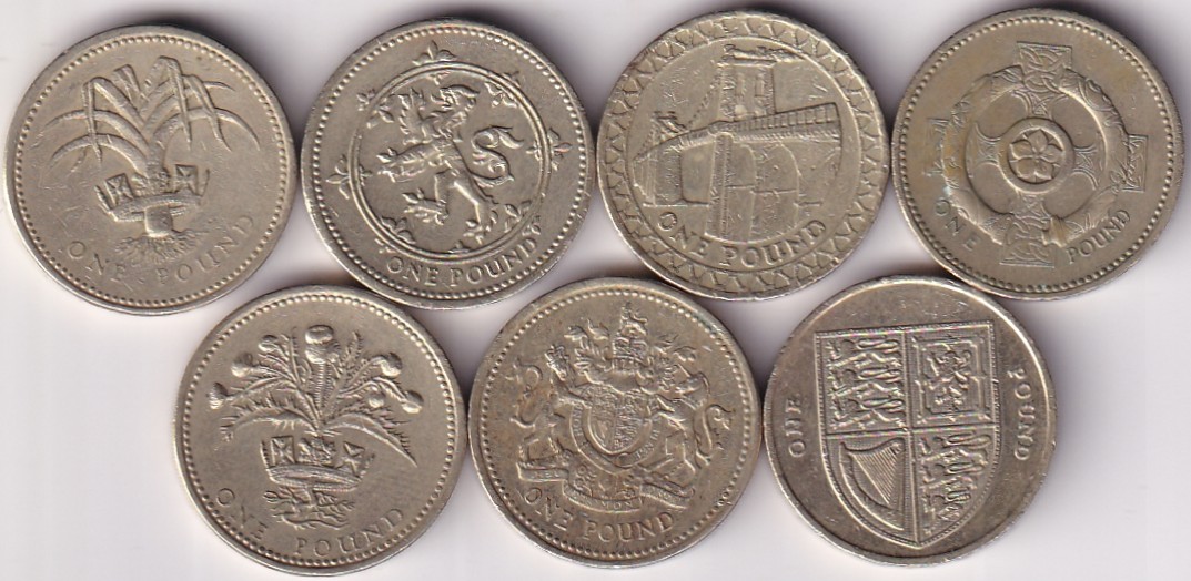 United Kingdom 1 Pound Seven Different Nickel Brass Coins Collection